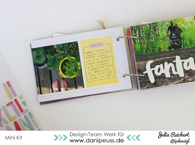 Gestaltungstipp Nr. 2: Aus der Folie, die im Kit drin ist, könnt ihr zum Beispiel kleine Kreise ausstanzen. Die eignen sich ans Papier getackert zum Beispiel als Tab (siehe Bild) oder auch als Verschluss (die Idee seht ihr im Video!).